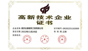 喜訊,重慶達(dá)康建筑工程有限公司順利通過重慶市科學(xué)技術(shù)局、重慶市財(cái)政局、國(guó)家稅務(wù)總局重慶市稅務(wù)局等部門的聯(lián)合評(píng)審驗(yàn)收,被正式認(rèn)定為“高新技術(shù)企業(yè)”,榮獲《高新技術(shù)企業(yè)證書》。